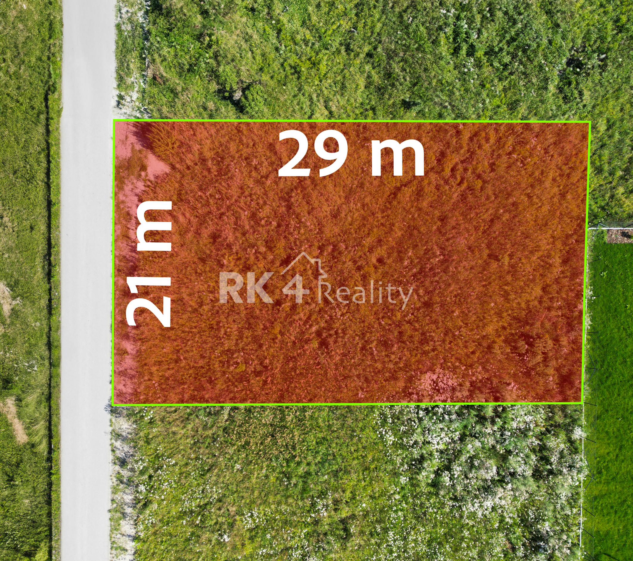 Výmera je 600m2 s rozmermi 21x29m.